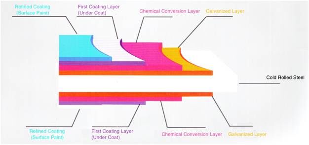 Based on cold-pressed steel plate and galvanized steel plate, through pre-processing (degreasing, cleaning and chemical treatment and continuous coating-painting of the surface, following by baking and cooling, color coating steel plate is made.
